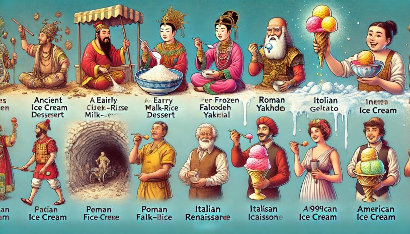 The earliest versions of ice cream can be traced back to ancient civilizations. Around 200 BCE, the Chinese are believed to have created a frozen mixture of milk and rice, cooled with packed snow. Meanwhile, in Persia (modern-day Iran), people enjoyed a chilled dessert called faloodeh, made with vermicelli noodles, rose water, and frozen syrup, stored in underground refrigeration chambers known as yakhchals.
