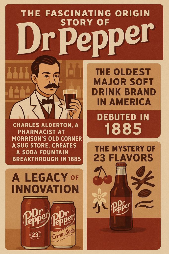 The story of Dr Pepper begins in 1885 in Waco, Texas, at Morrison’s Old Corner Drug Store. A young pharmacist named Charles Alderton worked there, crafting carbonated drinks for customers at the soda fountain. Alderton had a passion for experimenting with flavors, and he noticed that customers loved the fruity, spicy scents that filled the store. Inspired, he decided to create a soft drink that captured that aroma in liquid form.