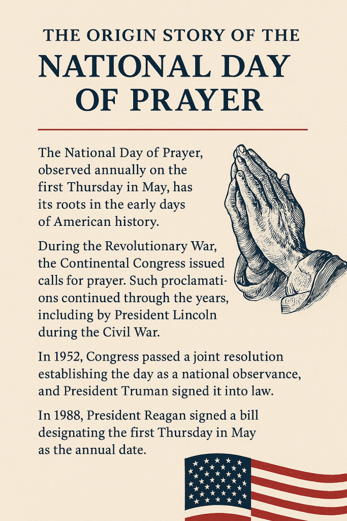 The National Day of Prayer, observed annually in the United States on the first Thursday of May, is a time-honored tradition that calls on people of all faiths to pray for the nation. Its roots trace back to the earliest days of American history, shaped by spiritual leaders, national trials, and legislative action.